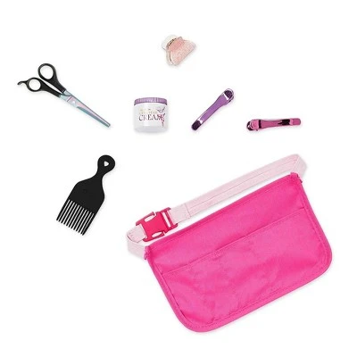 - Includes: 18-inch doll, top with colorful text, denim-style pants, undies, shoes, stylist apron, hair pick, cream jar, 3 hair clips, and pretend scissors.